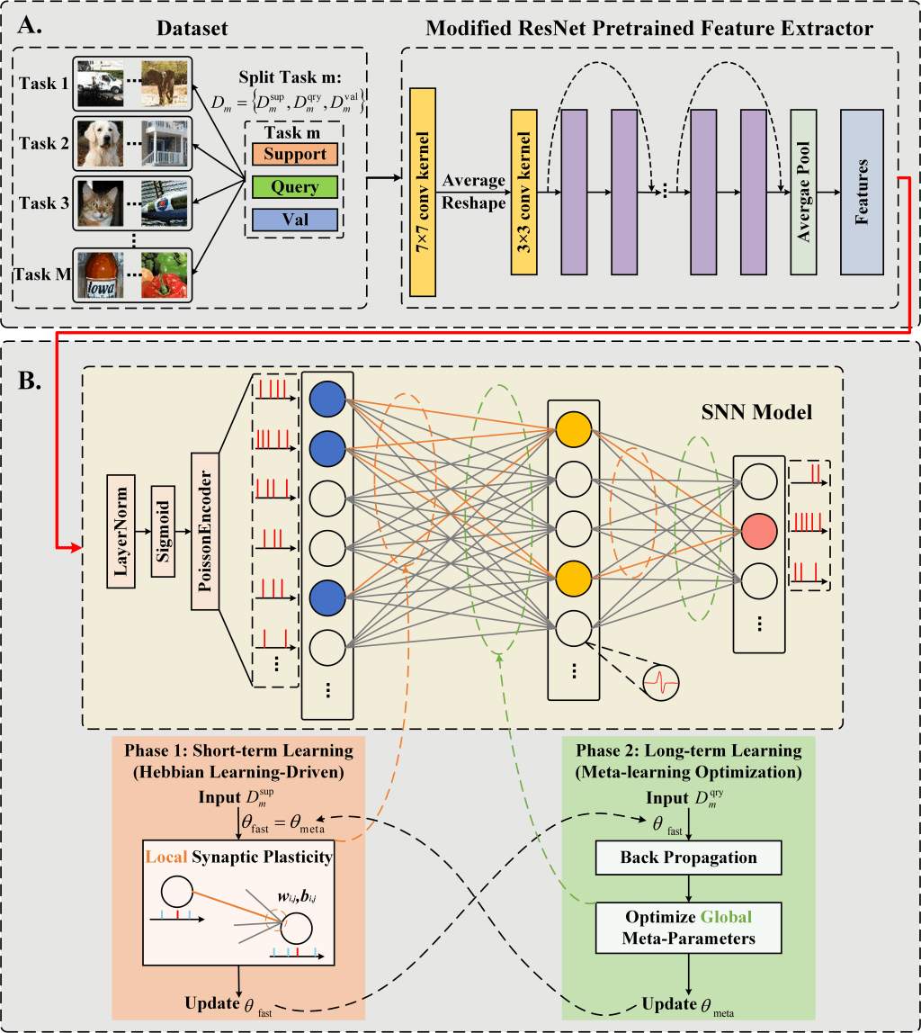 太原理工大学电子信息工程学院黄旭辉教授团队在类脑连续学习领域取得重要突破,该工作受人脑海马体-新皮层学习记忆机制启发,提出赫布学习(Hebbian learning)驱动的元学习(Meta Learning)框架,实现类脑脉冲神经网络的快速高效连续学习。相关论文成果以“HLML-SNN: Fast Continual Learning in Spiking Neural Networks Achieved via Hebbian Learning-Driven Meta-Learning”为题,成功被人工智能领域国际顶级会议AAAI-2026收录。AAAI是中国计算机学会(CCF)推荐的A类国际顶级会议,在人工智能领域享有较高的学术声誉。该论文的第一署名单位为太原理工大学,通讯作者为黄旭辉教授和侯庆山博士,共同第一作者为硕士研究生徐姜帅和薛珮芸副教授。