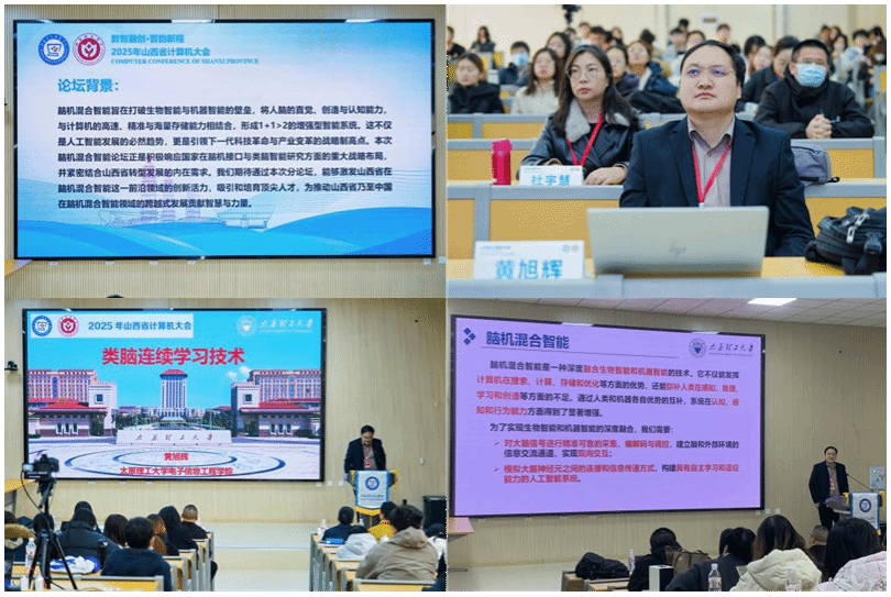 11月14日至16日,2025年山西省计算机大会在山西太原成功举办,大会主题为“数智融创 晋韵新程”。11月16日,太原理工大学电子信息工程学院院长黄旭辉教授应邀出席本次大会“脑机混合智能”青年科技创新论坛,并作题为《类脑连续学习技术》的主旨报告,介绍了团队在脑机混合智能与类脑连续学习算法方面的最新研究进展。