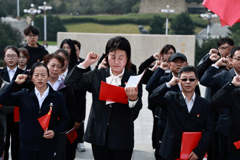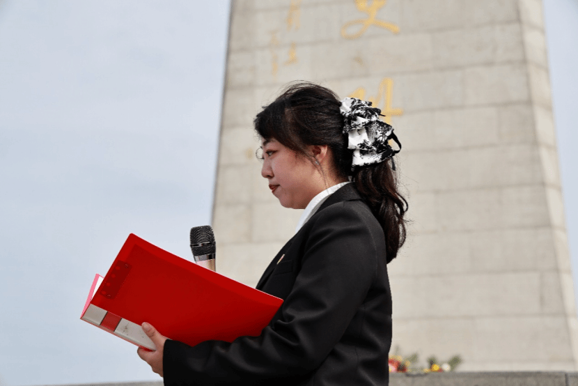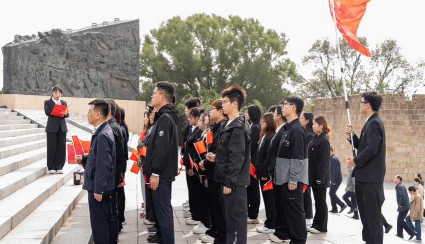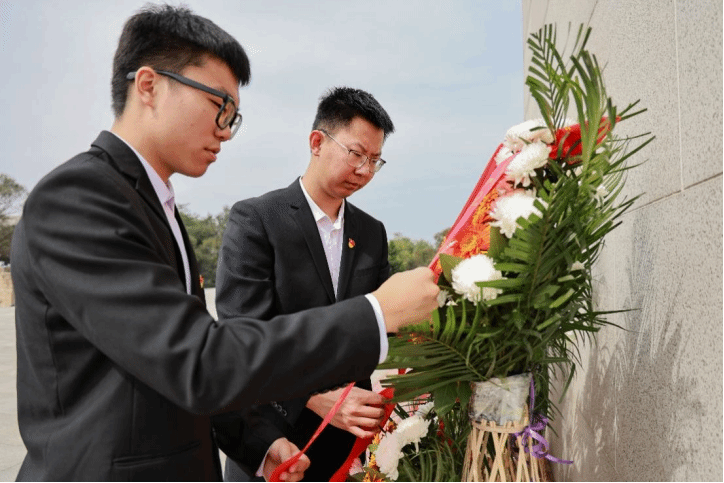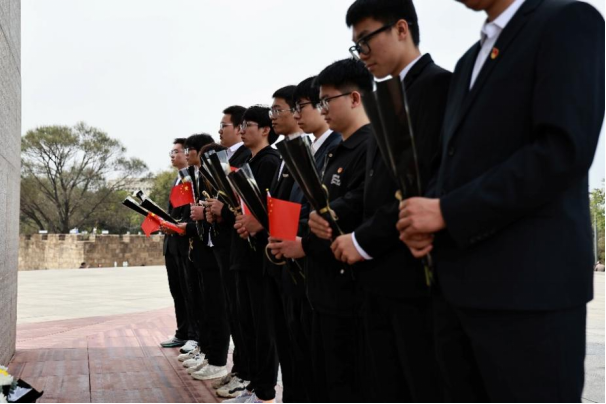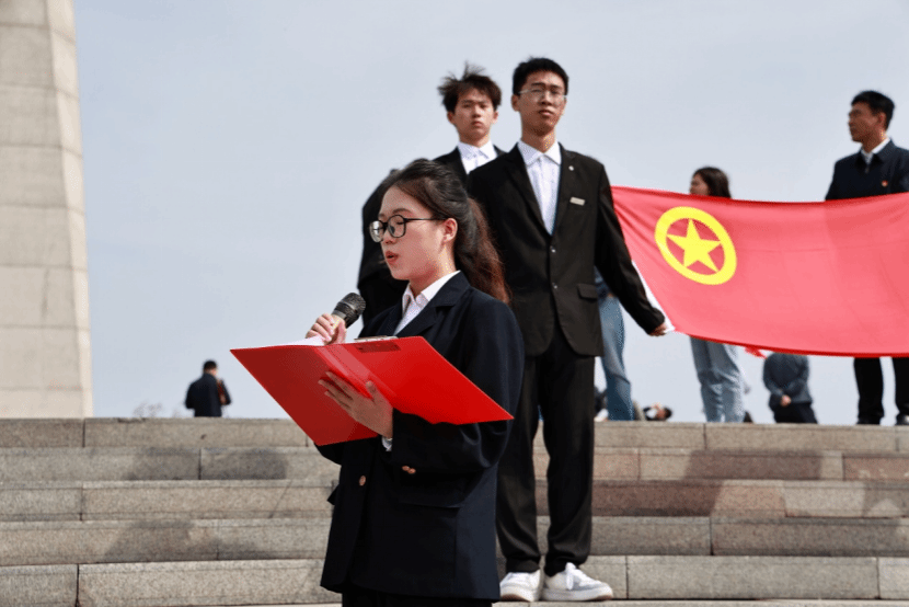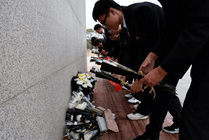 在敬献花束环节,全体人员从纪念碑左侧有序上前,将手中的白菊轻轻摆放在献花平台,绕行瞻仰纪念碑,每一步都饱含着对先烈的追思。在朱晋华书记的领誓下,全体党员面向党旗,举起右拳,重温入党誓词。随后,全体团员在院团委学生副书记张鼎崴的带领下,重温入团誓词,青春的誓言与历史的回响交织,彰显着新时代青年继承先烈遗志的坚定决心。