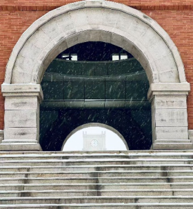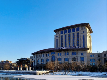 米黄外墙接了层薄雪,玻璃幕墙映着流云般的雪絮,连台阶的缝隙里都积了绒绒的白。