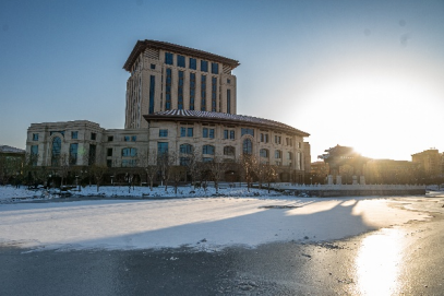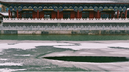 明向湖的冬,是半冰半水的温柔:红墙飞檐落了雪,冰面裂出的水痕漏着深绿,是冬没藏好的心事。流水撞着覆雪石景,风都慢下来听这轻响;亭台裹着银霜,与暖光漫窗的教学楼遥遥相对,枝桠剪碎落雪,把天地的白晕成浸着诗意的画。雪裹了岸、静了柳,连石阶绒白里,都藏着初雪的软。