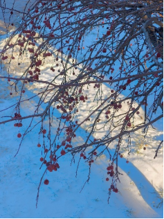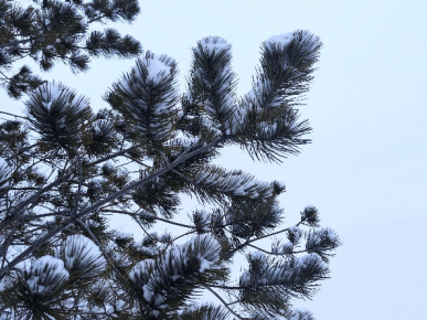 松针裹着雪团,像攒了满枝的碎星;秃枝伸向浅灰的天,枝梢落雪是风揉的短诗。