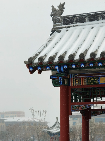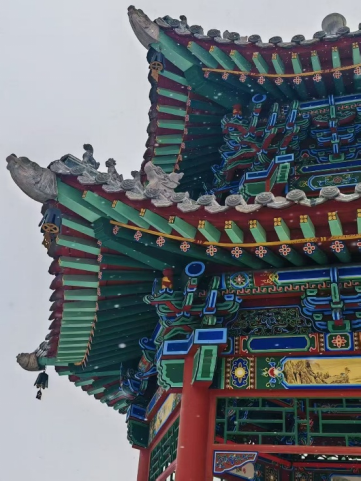 雪絮落在飞檐彩画上,将青蓝与朱红晕得温软。斗拱纹路裹着细雪,檐角瑞兽驮着银霜,悬铃浸在冷雾里 —— 古意与落雪撞个满怀,每道纹路都藏着太理冬的细腻。抬眼时雪从檐角漏下,又给这建筑添了笔轻软的诗意。